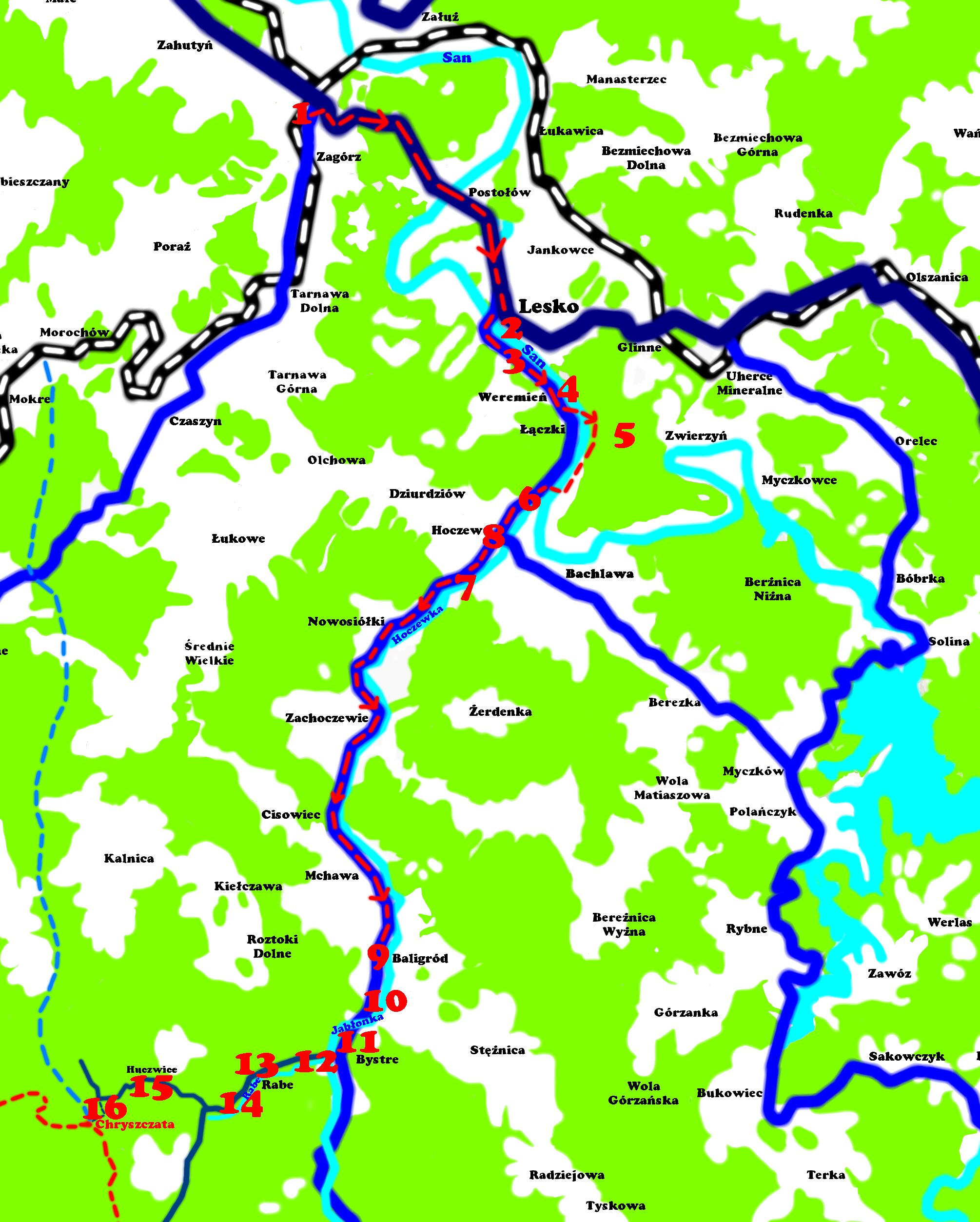 „Po całodziennej podróży koleją wysiedliśmy na stacji w Zagórzu (1) i udaliśmy się do pobliskiej wioski, do pana Jana Sekundusa. Pozwolił nam rozłożyć pierwsze nasze obozowisko w sadzie koło swego domu. (…) Nocowaliśmy w Lesku (2), które jest jakby bramą wypadową w Bieszczady. Nad brzegiem Sanu znaleźliśmy wolne miejsca w domkach campingowych, nie było więc kłopotu z rozbijaniem obozu i nie musieliśmy sobie przygotowywać śniadań ani kolacji, bo na campingu była stołówka. (…) Nazajutrz wczesnym rankiem pomaszerowaliśmy w stronę Chryszczatej. Wygodną asfaltową szosą (3) szliśmy najpierw wzdłuż lewego brzegu Sanu (4), piękną malowniczą doliną. Przez kilka kilometrów wciąż mogliśmy podziwiać tę rzekę, dość szeroką, lecz bardzo płytką, zaledwie po kostki. (…) Aż do wsi Hoczew towarzyszył nam z prawej strony San, a po lewej lesiste wysokie stoki góry Czulni (5), wysokiej na 576 m. Przed wsią Hoczew szosa odchodzi od Sanu (6) i odtąd prowadzi doliną rzeki Hoczewki (7), przeskakując mostami raz na jej lewy, raz na prawy brzeg. W Hoczwi (8) zwiedziliśmy stary kościół zbudowany w 1510 roku i staropolską karczmę. Przy okazji dowiedzieliśmy się, że Hoczew opisuje Fredro w utworze „Trzy po trzy”. „Po całodziennej podróży koleją wysiedliśmy na stacji w Zagórzu (1) i udaliśmy się do pobliskiej wioski, do pana Jana Sekundusa. Pozwolił nam rozłożyć pierwsze nasze obozowisko w sadzie koło swego domu. (…) Nocowaliśmy w Lesku (2), które jest jakby bramą wypadową w Bieszczady. Nad brzegiem Sanu znaleźliśmy wolne miejsca w domkach campingowych, nie było więc kłopotu z rozbijaniem obozu i nie musieliśmy sobie przygotowywać śniadań ani kolacji, bo na campingu była stołówka. (…) Nazajutrz wczesnym rankiem pomaszerowaliśmy w stronę Chryszczatej. Wygodną asfaltową szosą (3) szliśmy najpierw wzdłuż lewego brzegu Sanu (4), piękną malowniczą doliną. Przez kilka kilometrów wciąż mogliśmy podziwiać tę rzekę, dość szeroką, lecz bardzo płytką, zaledwie po kostki. (…) Aż do wsi Hoczew towarzyszył nam z prawej strony San, a po lewej lesiste wysokie stoki góry Czulni (5), wysokiej na 576 m. Przed wsią Hoczew szosa odchodzi od Sanu (6) i odtąd prowadzi doliną rzeki Hoczewki (7), przeskakując mostami raz na jej lewy, raz na prawy brzeg. W Hoczwi (8) zwiedziliśmy stary kościół zbudowany w 1510 roku i staropolską karczmę. Przy okazji dowiedzieliśmy się, że Hoczew opisuje Fredro w utworze „Trzy po trzy”. W Hoczwi dopisało nam szczęście. Pan profesor zatrzymał jadącą do Baligrodu pustą ciężarówkę, która zabrała naszą gromadę. W ten sposób drogę do Baligrodu (9) przejechaliśmy szybko i wygodnie. Obiad zjedliśmy w gospodzie, a następnie zwiedziliśmy miasteczko. Narwaliśmy polnych kwiatów i złożyliśmy je na cmentarzu 34 pułku piechoty, który szczególnie odznaczył się w walce z oddziałami UPA. (…) Dolina rzeki Hoczewki, zwanej tu Jabłonką (10), zwęża się, co daje wrażenie, jakby wchodziło się w czarną gardziel. Lecz oto przystanek PKS-u o nazwie Bystre (11). Odgałęzia się stąd droga w prawo (12) do Rabego, prowadząca wzdłuż potoku o tej samej nazwie. Rabe (13) — to była kiedyś duża wieś, gdzie mieli swój piękny dwór rodzice Aleksandra Fredry. Teraz jednak wieś ta już nie istnieje. Droga wzdłuż potoku Rabego (14) jest bardzo malownicza. Za zakrętem doliny otwiera się widok na gołoborze, stok usłany głazami, wśród których kurczowo trzymają się urwiska karłowate świerki, jarzębiny i osiki. (…) Po drodze napotkaliśmy nowe zabudowania, lecz poza tym — zupełne pustkowie. Przy zabudowaniach odpoczywali robotnicy, zapewne drwale. Poinformowali nas, że na Chryszczatą możemy pójść albo ścieżką przez ruiny dawnej wsi Rabe, albo wzdłuż bocznego potoku przez spaloną przez ukraińskich faszystów wieś Huczwice (15). Potem już sami zorientujemy się w kierunku marszu, gdyż ujrzymy zielony masyw Chryszczatej. Gdy profesor i chłopcy oddalili się nieco, wróciłem do robotników i zapytałem o zagrodę Józefa Gnata. — Musisz pójść brzegiem bocznego potoku przez Huczwice. Za tą wsią, nad potokiem, stoi zagroda Gnata — powiedział mi jeden z robotników. (…) Mój zastęp sprawnie rozbijał obozowisko u podnóża Chryszczatej (16), a ja zawiadomiłem profesora, że zamierzam dokonać zwiadu w okolicy.” (Rzdz 5)