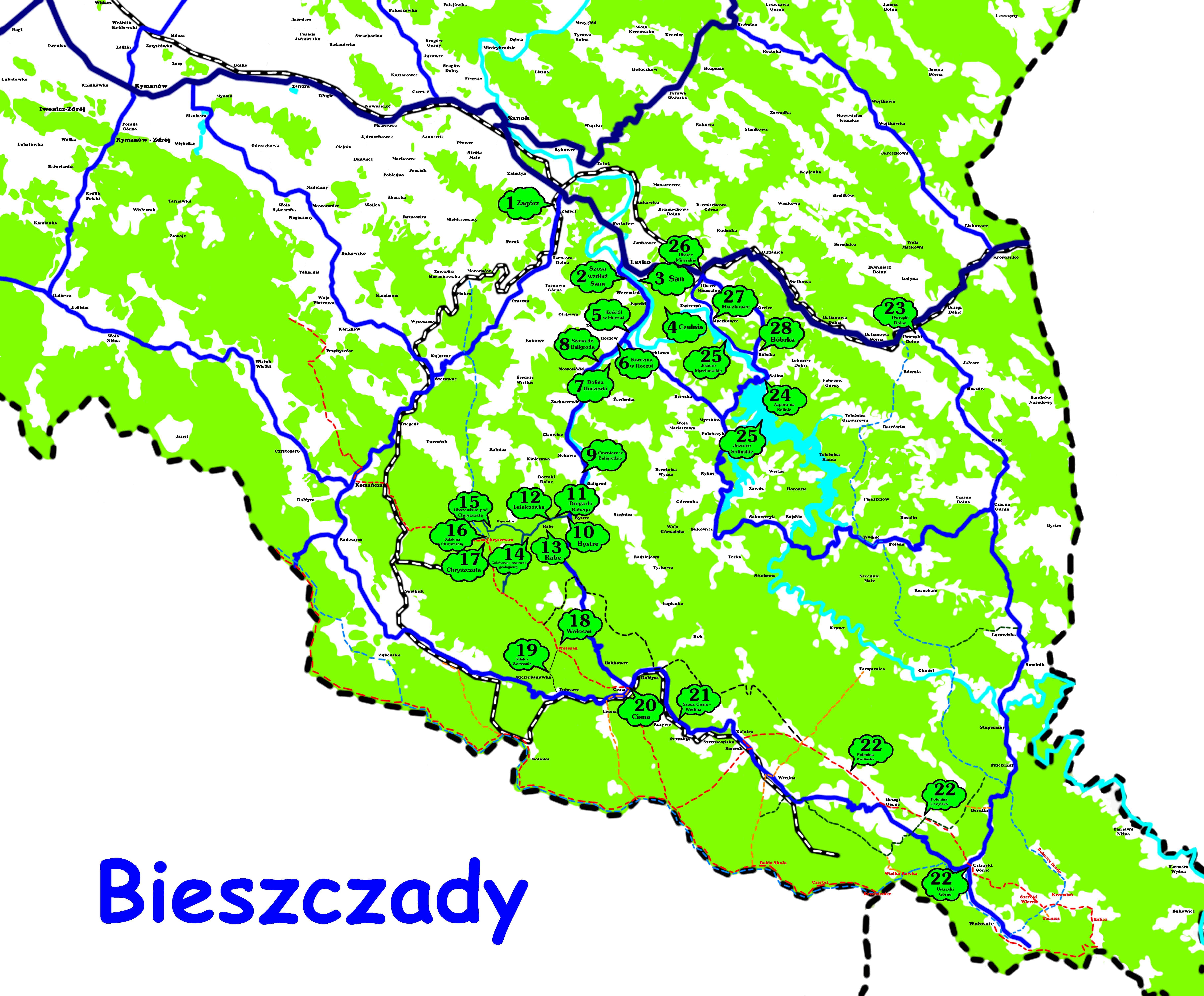 Trasa zaproponowana przez Tomasza: „Lecz mój długopis sunął dolinami. — Radzę wam najpierw zwiedzić Lesko (1) i okolice — mówiłem. — Potem Hoczew (2), Uherce (3), Ustianową (4), Ustrzyki Dolne (5), Hoszów (6), Czarną (7) i Lutowiska (8). Następnie wrócić do Ustrzyk Dolnych i pomaszerować na Liskowate (9) i wyżej, aż na Kuźminę (10) i Tarnawę Wołoską (11), skąd przez Słonne Góry (12) można dojść do Sanoka (13), gdzie jest piękne regionalne muzeum.”